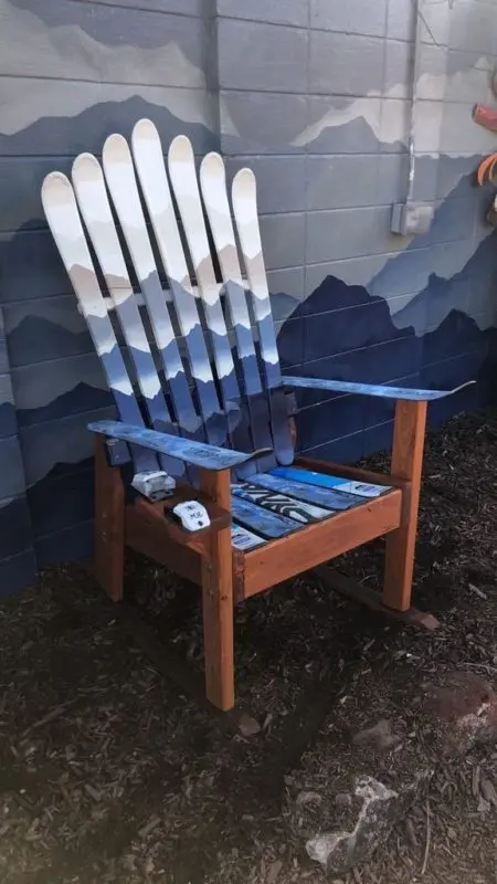 - Constructed in Colorado from retired skis on a sturdy Douglas Fir base. All chairs include a custom ski binding cup holder. Big enough for a stein.