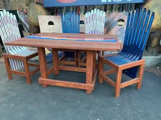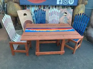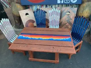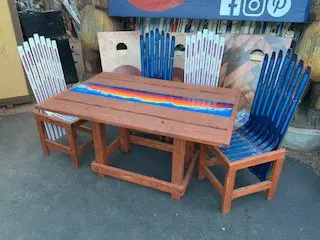 Set of (5) – (1) LARGE PATIO DINING TABLE W/ SNOWBOARD RUNNER & (4) Patio Dining Ski Chairs (Customizable)