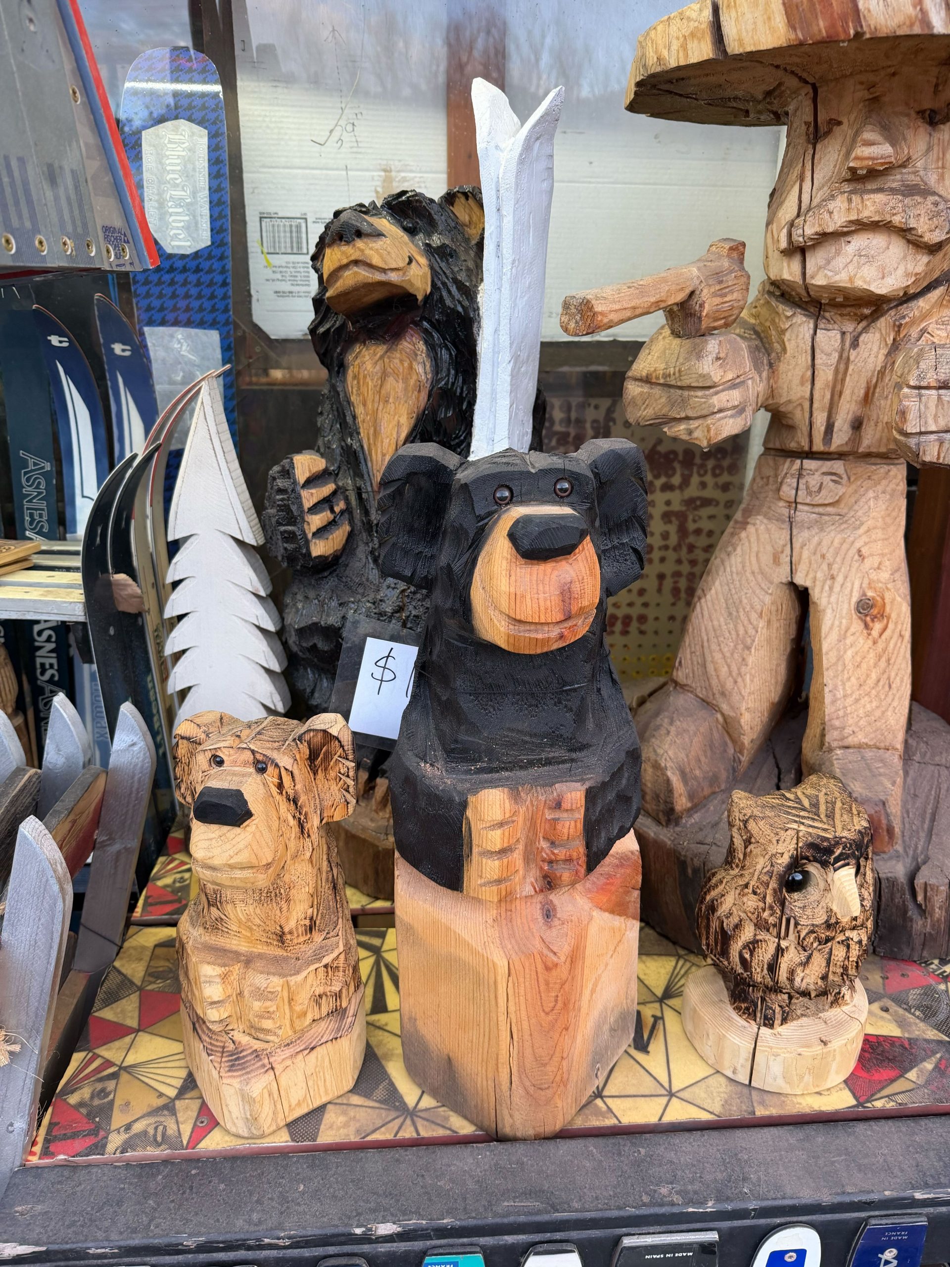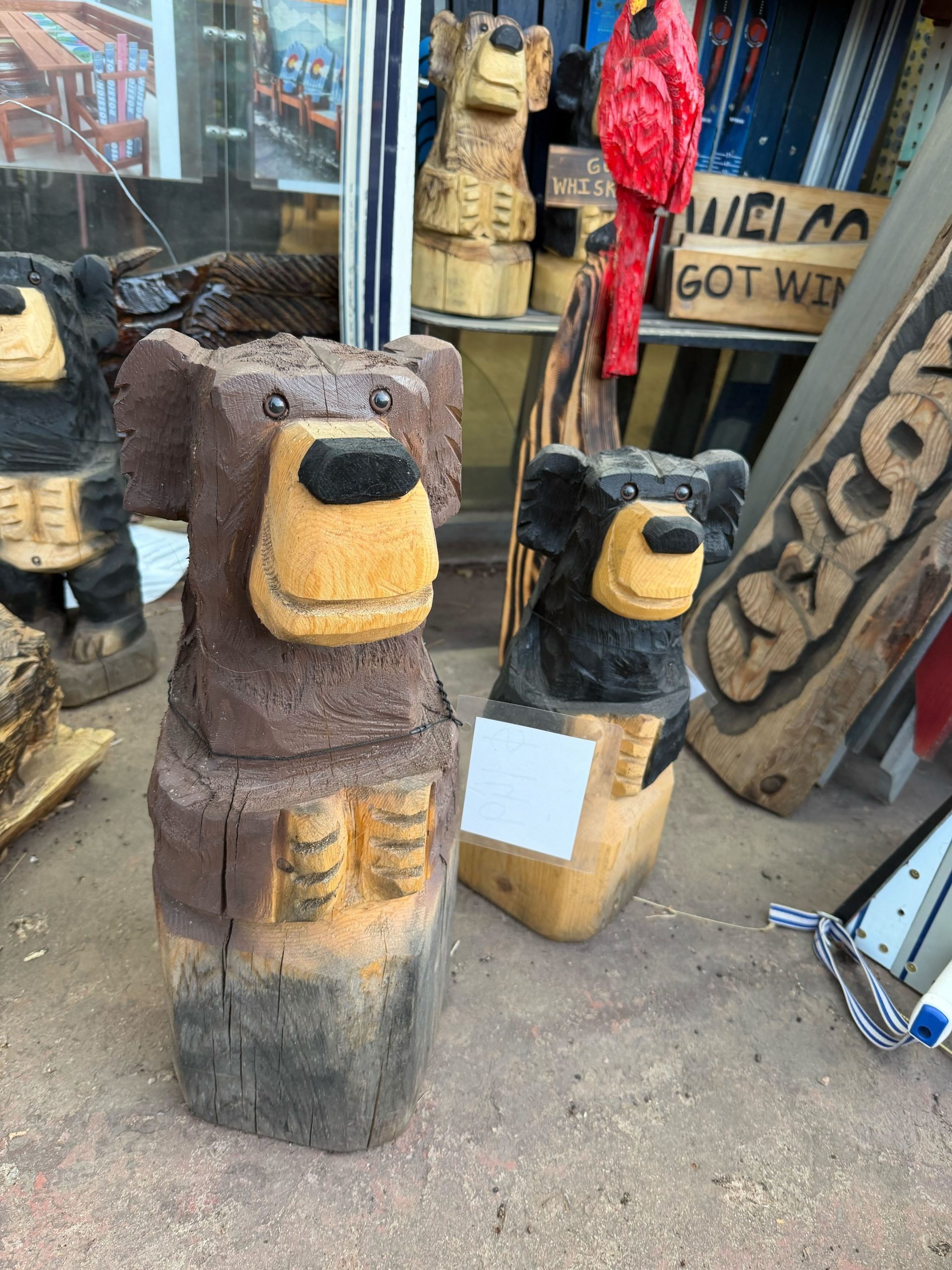 Our popular wooden bears start at $59 (small) and go up to about $750ish, most of them are in the $150-250 range for medium sized ones. Text us now #303-775-7273 for current availability and we can let you know right away! We also have moose, wolves, fox, beaver, raccoon, owls, pelicans, turtles, pigs, and more!