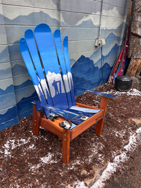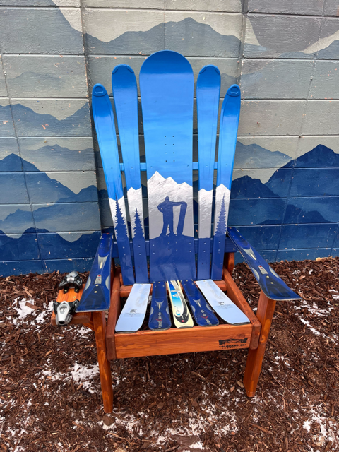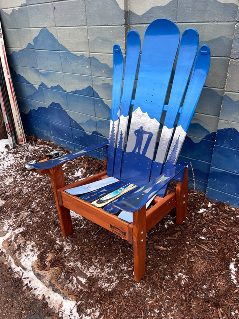 - Constructed in Colorado from retired skis on a sturdy Douglas Fir base. All chairs include a custom ski binding cup holder. Big enough for a stein.