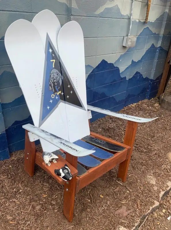 - Constructed in Colorado from retired skis on a sturdy Douglas Fir base. All chairs include a custom ski binding cup holder. Big enough for a stein.