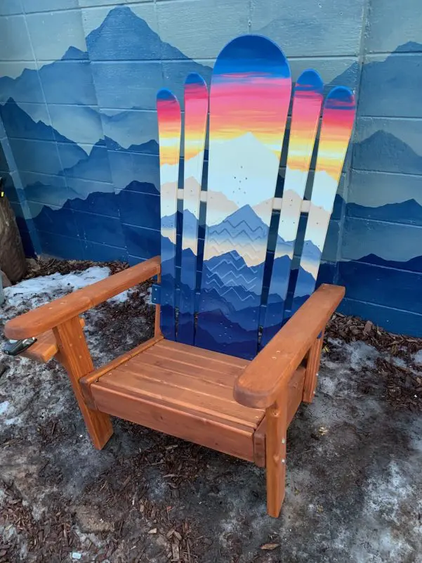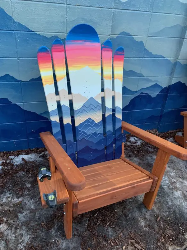 - Constructed in Colorado from retired skis on a sturdy Douglas Fir base. All chairs include a custom ski binding cup holder. Big enough for a stein.