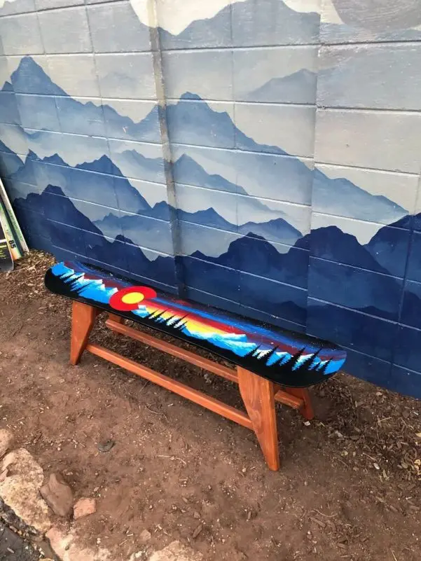 This stylish bench is made from repurposed snowboards, ideal for any lover of the slopes. Transform your space into a sporty, yet stylish display. Reminisce good memories with family and friends on this unique piece of Colorado gear! Built with quality in mind, this bench offers both comfort and durability.