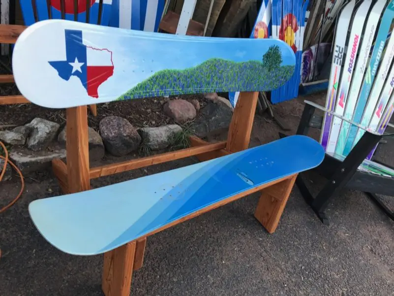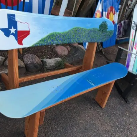 This stylish bench is made from repurposed snowboards, ideal for any lover of the slopes. Transform your space into a sporty, yet stylish display. Reminisce good memories with family and friends on this unique piece of Colorado gear! Built with quality in mind, this bench offers both comfort and durability.