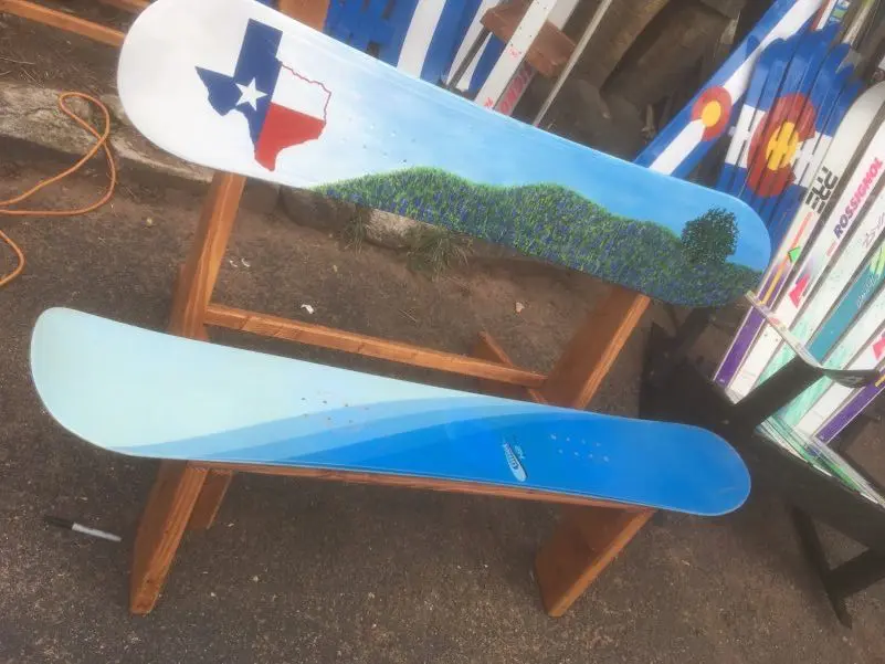 Hand painted designs like our Sunset Mountain Mural Snowboard Bench take time and are made to last in the elements. We hand paint almost all of our designs with exterior oil paint and make sure you’ll get a product that’s both beautiful and durable. We charge $75/hour for customization so think about what you’d like to add to your unique design and we can add just about anything you can dream up!