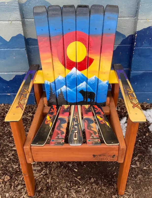 The “Colorado Flag Sunset Mountain & Bear ALPINE” Chair – Our NEW Modern Indoor/Outdoor (More Compact Design) Snowboard & Ski Chair