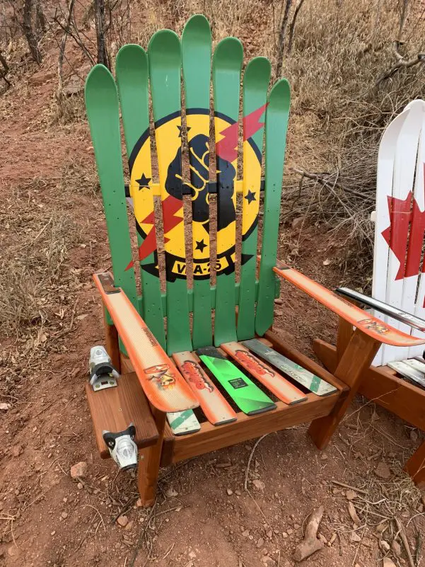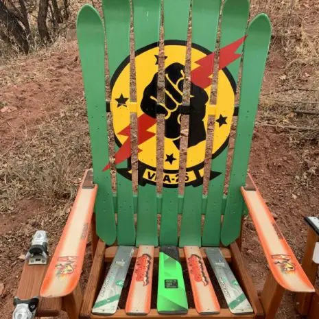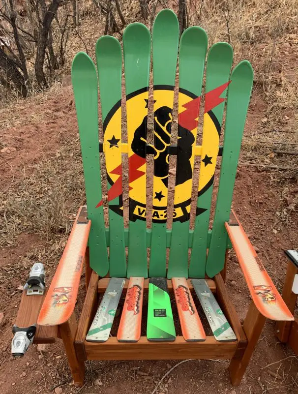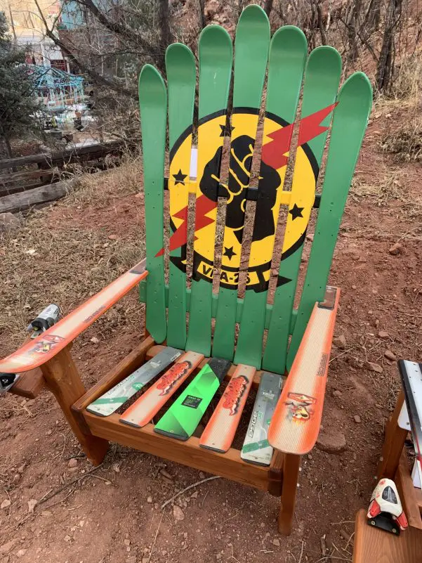 - Constructed in Colorado from retired skis on a sturdy Douglas Fir base. All chairs include a custom ski binding cup holder. Big enough for a stein.