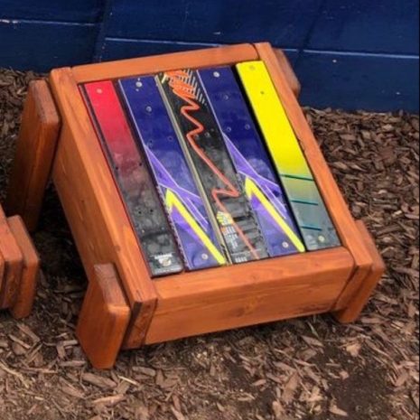 Our chairs, benches, rockers & ottomans are all hand made from scratch right here in Colorado from recycled skis, quality lumber and hardware, and lots of love and care! We’ve grown tremendously in quality and craftsmanship the past 5 years and offer a much higher quality product than we did in our early years. We make it look easy but our furniture takes a lot of time, attention to detail and many steps to complete and keep our customers happy. NEW Ski Ottoman footrests.